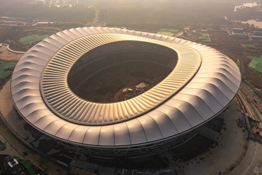 体育场建成投用后,观众在观看赛事的同时还能透过立面开放式铝格栅幕墙感受“风从太湖来”的惬意。“ETFE膜材透光性极高,可为场芯提供充足的自然光照。”该负责人介绍,“高透光的ETFE屋面膜可以扩大场芯草坪的受光面积和时间,为草坪的生长提供良好的自然条件。同时,ETFE气枕膜还可以隔绝部分光照热量,让看台上观众有更好的观赛体验。”